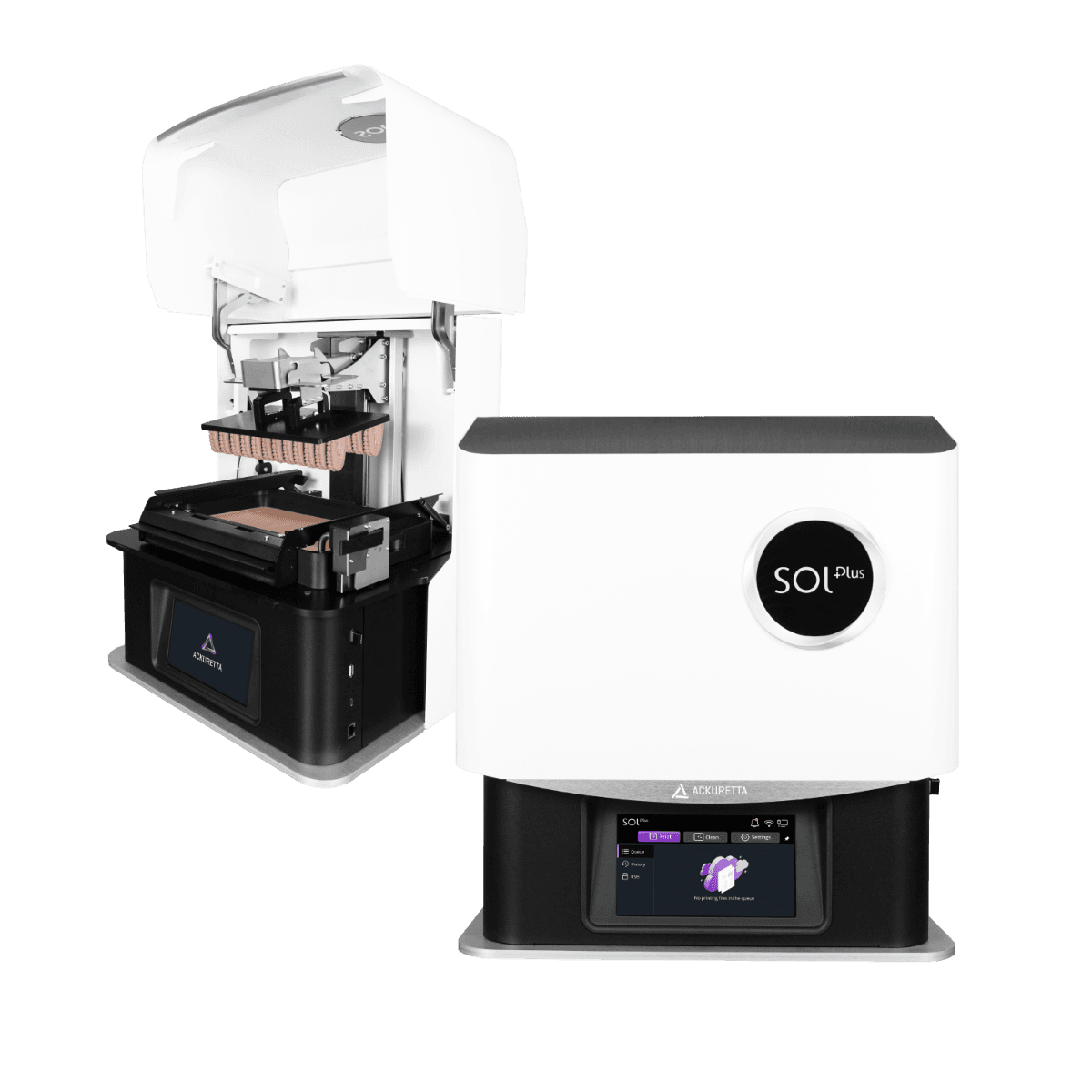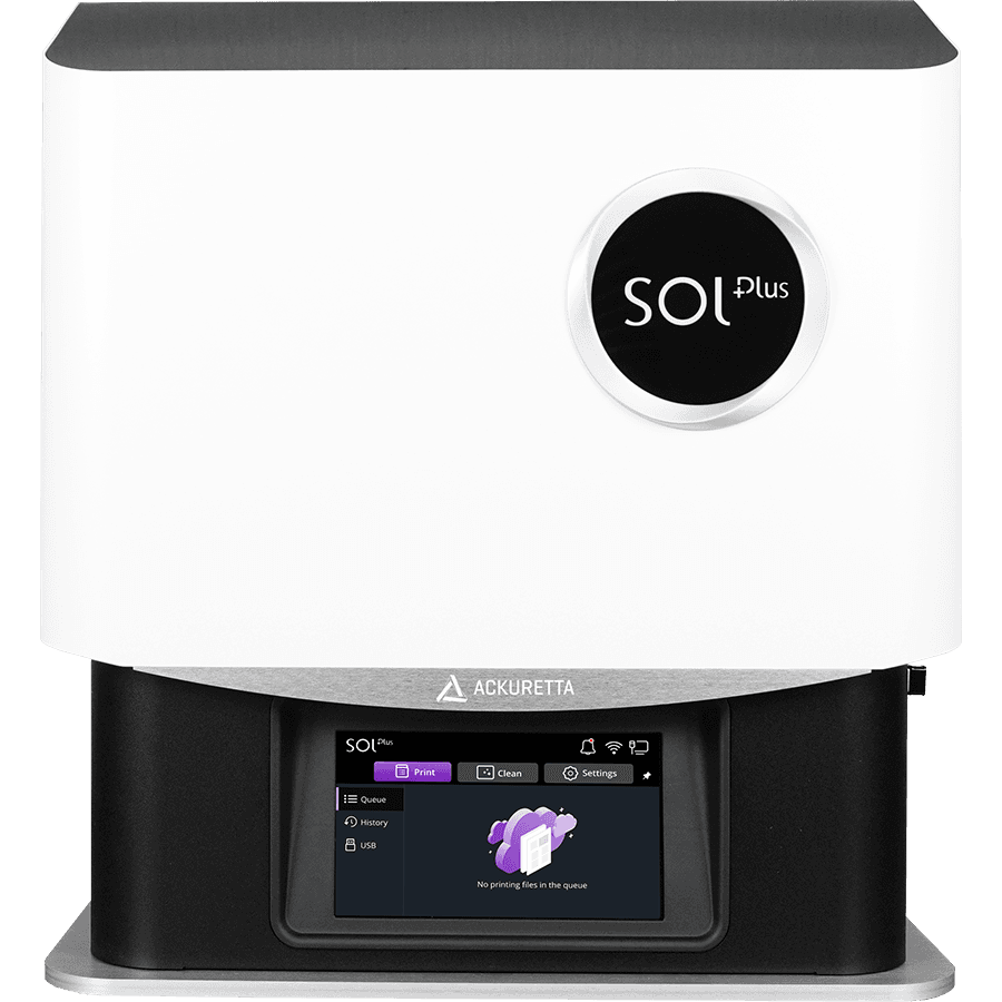 SOL Plus is designed for high-volume and precision 3D printing in dentistry. It is equipped with an extra-large build platform that fits up to 28 full arch prints (printed vertically) in a single print. With a 45-micron XY resolution, and the option to print layers as thin as 30 microns, SOL Plus achieves exceptionally detailed 3D prints meeting the esthetic requirements of dentistry. A removable Thermal Agitator (heating rod) ensures optimal print results in any environment. The SOL Plus is validated with 150+ best-in-class resins, with automatic cloud updates, for models, long-term provisionals, splints, dentures, and more. It includes the Ackuretta Concierge Service for remote onboarding, training, and support throughout the 2-year warranty.
