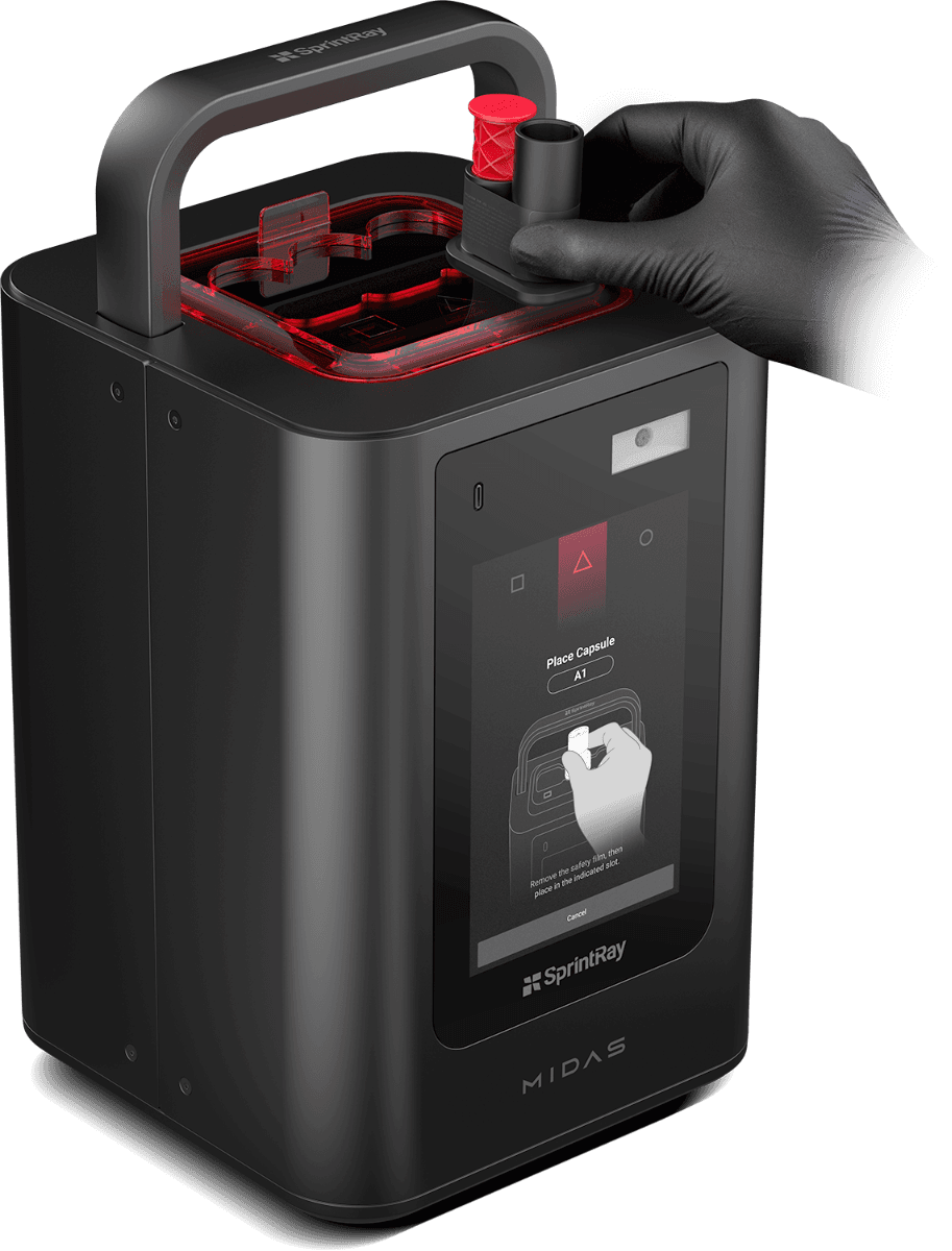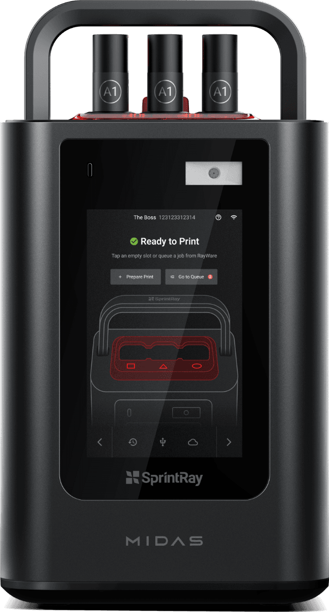 The SprintRay Midas is a compact, high-precision digital press designed for dental practices. Utilizing advanced resin capsule technology, Midas 3D prints single-unit crowns, inlays, onlays, and veneers in just 10 minutes with unmatched accuracy and ease. Its intuitive operation empowers dentists to deliver same-day restorations seamlessly and efficiently.